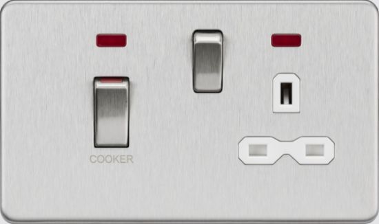 Flat plate 45A DP Switch & 13A Socket with Neons - Brushed Chrome with White Insert